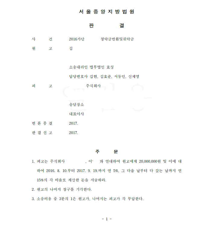이에 저는 즉시 민사소송으로 분양대금(분양청약금)의 반환을 구하면서 증인신문, 당사자본인신문, 사실조회 등으로 분양계약서의 진정성립을 입증하였습니다. 이에 법원은 저희의 주장을 인용하는 판결을 선고하였습니다.