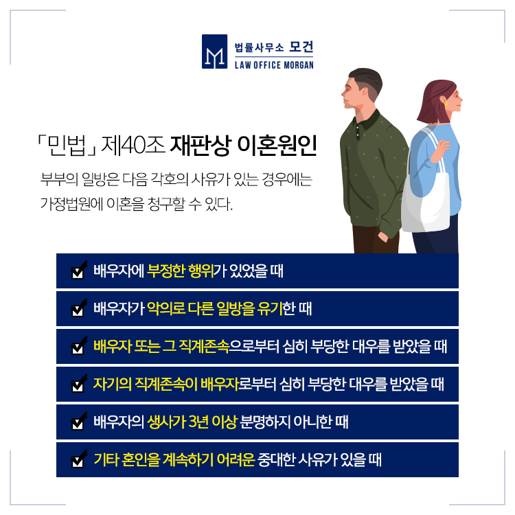 다양한 케이스의 협의이혼, 조정이혼, 재판상이혼을 맡아 의뢰인에게 최선의 결과를 이끌어 낸 바 있는 베테랑 이혼전문변호사로서 상담부터 전 과정을 대표 변호사가 책임지고 진행하고 있습니다. 황혼이혼, 전업주부이혼에 있어 법률도움이 필요하신 분들은 법률사무소 모건으로 문의하시기 바랍니다.