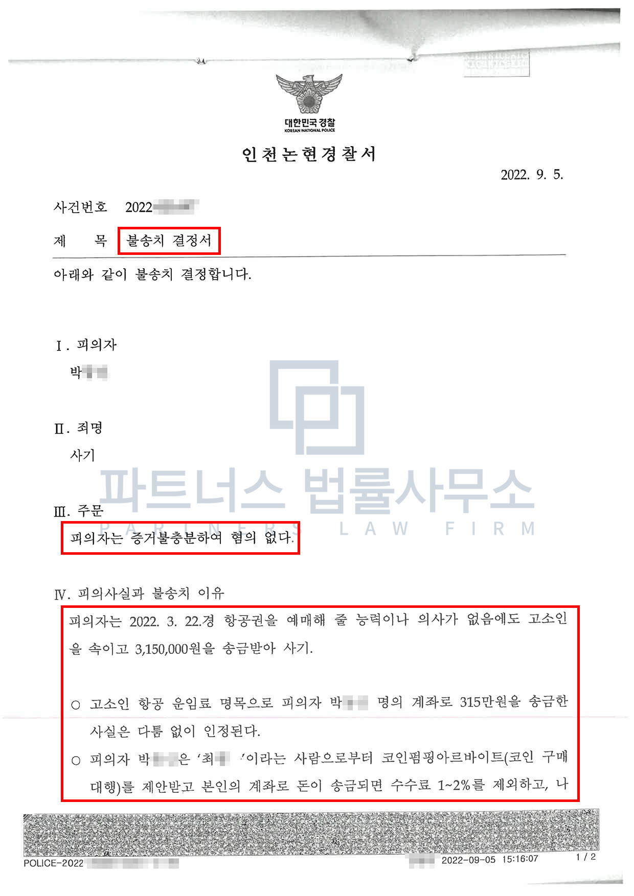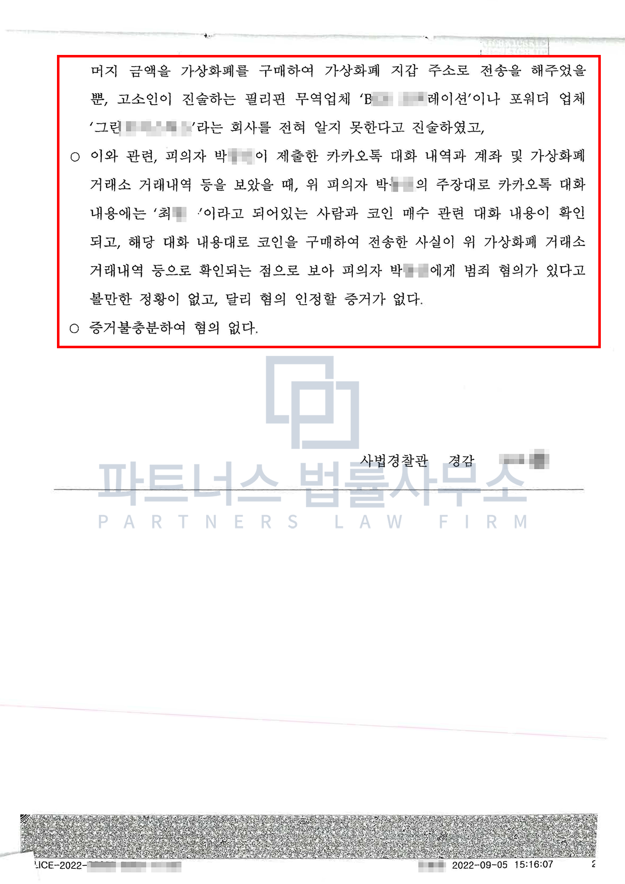 의뢰인의 경우 코인구매대행 알바를 한다고 생각하였는데 결과적으로 알고 보니 자신의 통장이 보이스피싱 대포통장으로 이용되었던 경우로, 자신의 통장에 구매대행 금액으로 들어온 돈은 보이스피싱 피해 금액이었고, 코인을 구매해서 전달한 것은 결국 보이스피싱범들에게 전달한 것이었습니다. 의뢰인이 자신에게 알바를 시킨 사람이 보이스피싱범이라는 것을 확실히 몰랐다고 하더라도 요즘에는 미필적 고의 때문에 처벌을 받기 때문에 저희 파트너스법률사무소의 치밀한 조력으로 결국 미필적 고의 인정 싸움에서 이겨 무혐의 결정을 받게 되었던 사안입니다.