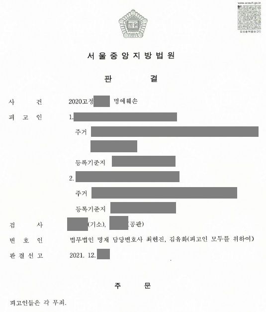 법원은 의뢰인들에게 무죄를 선고하였습니다. 의뢰인들은 성추행 가해자로부터 오히려 명예훼손죄로 역고소를 당하여 형사처벌의 위험에 처하였으나, 무죄 판결을 선고받아 억울함에서 벗어나고 정의를 바로 세울 수 있었습니다.
