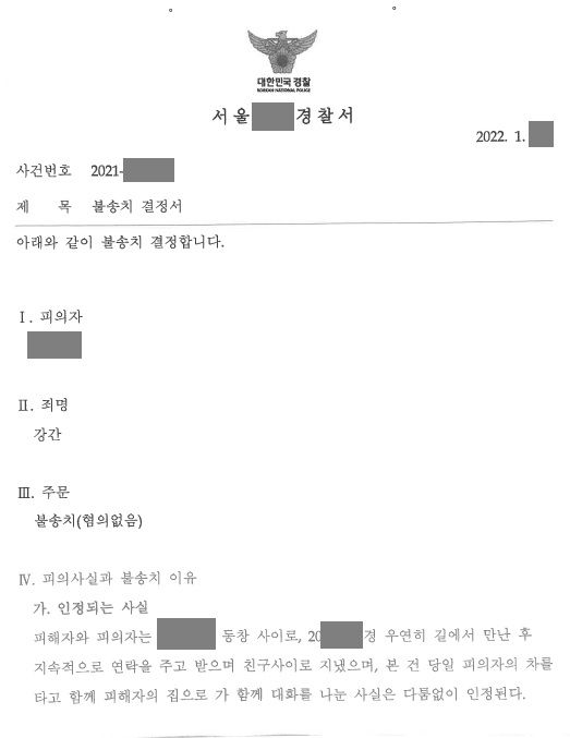 경찰은 의뢰인이 여자 동창과 다시 만나게 된 경위부터 친분을 쌓다가 결국 합의하에 성관계에 이르기까지 된 경위에 대한 진술이 구체적이고, 복원을 통해 확보된 일부 대화 내용 중에 성관계 이후에도 일상적으로 주고받은 대화 내용이 남아있어 범죄 혐의를 인정할 만한 증거가 불충분하다는 등의 이유로 불송치결정(혐의없음)을 하였습니다.