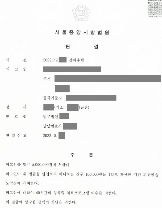 가해자는 처음에는 혐의를 전면 부인하였으나 결국 검찰에 의해 기소된 이후 법원에서는 혐의를 모두 인정하였고, 의뢰인과 합의를 하였습니다. 의뢰인은 합의금을 통해 정신적 충격을 조금이나마 위로받을 수 있었고, 가해자는 합의를 통해 의뢰인으로부터 용서를 받아 그나마 엄벌을 피한 채 벌금 500만원과 40시간의 성폭력 치료프로그램 이수 판결을 선고받는 것에 그칠 수 있었습니다.