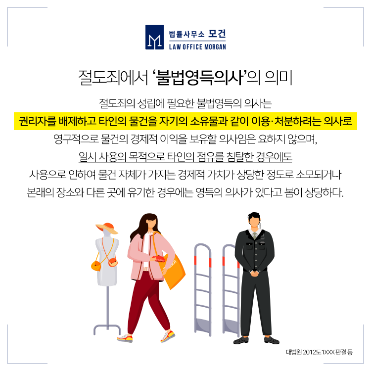 절도죄와 점유이탈물횡령죄는 범행의 대상과 형량의 차이가 있는데요. 다만 '불법영득의 의사'가 있어야 성립한다는 것은 동일합니다. 여기서 말하는 '불법영득의 의사'란 타인의 재물 등을 자기의 소유인 것처럼 사실상 또는 법률상 처분하려는 의사를 말합니다. 이처럼 관련 혐의에 대해 법리적인 판단이 중요하므로 형사전문변호사를 찾아 자세한 도움을 구하는 것이 좋습니다.