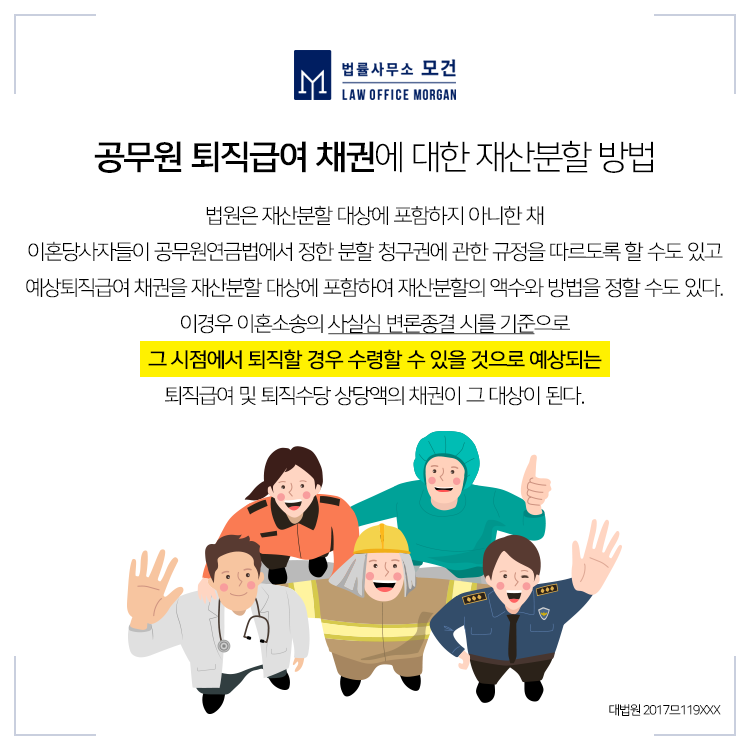 법원은 재산분할청구 사건에서 위와 같은 사정을 고려하여 예상퇴직급여 채권을 재산분할 대상에 포함하여 재산분할의 액수와 방법을 정할 수도 있고, 재산분할 대상에 포함하지 아니한 채 이혼당사자들이 공무원연금법에서 정한 분할연금 청구권, 퇴직연금일시금 등 분할 청구권에 관한 규정을 따르도록 할 수도 있습니다.