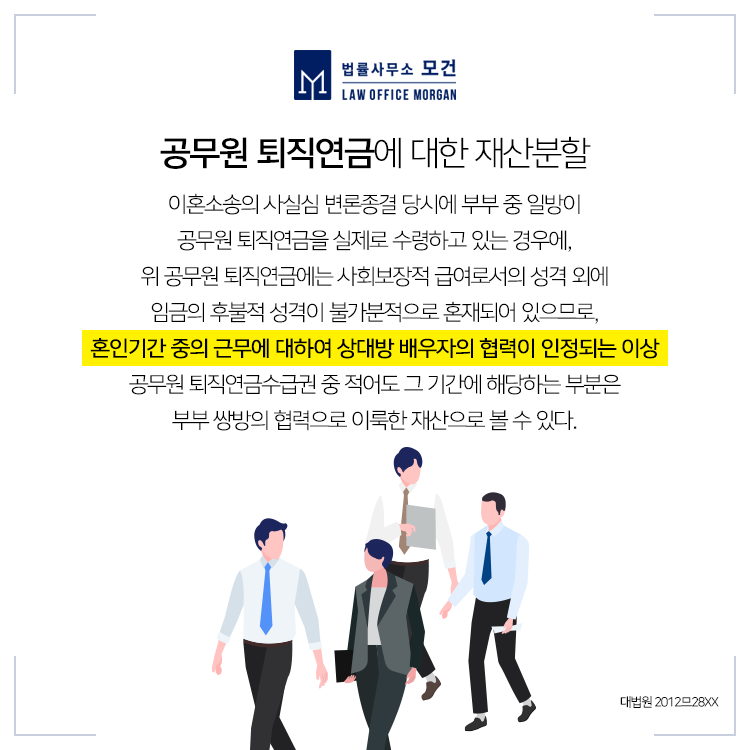 특히 상대방이 공무원으로 퇴직하여 연금을 수령하고 있거나, 혹은 이혼 당시 아직 공무원으로 재직중이어서 실제 퇴직연금이나 퇴직수당을 수령하지 않았어도 이는 잠재적 재산에 해당되므로 재산분할 대상에 포함시킬 수 있습니다. 그렇다면 그간 이혼소송에서 법원이 인정해 온 공무원연금 재산분할 사례에 대해서 알아보도록 하겠습니다.