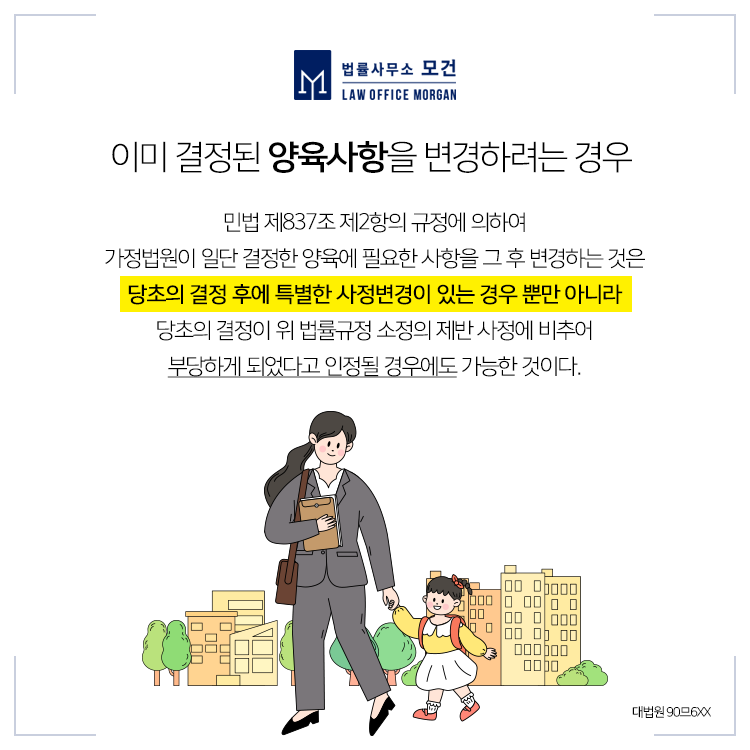 「민법」 제837조 "가정법원은 자(子)의 복리를 위하여 필요하다고 인정하는 경우에는 부ㆍ모ㆍ자(子) 및 검사의 청구 또는 직권으로 자(子)의 양육에 관한 사항을 변경하거나 다른 적당한 처분을 할 수 있다"고 정하고 있습니다.