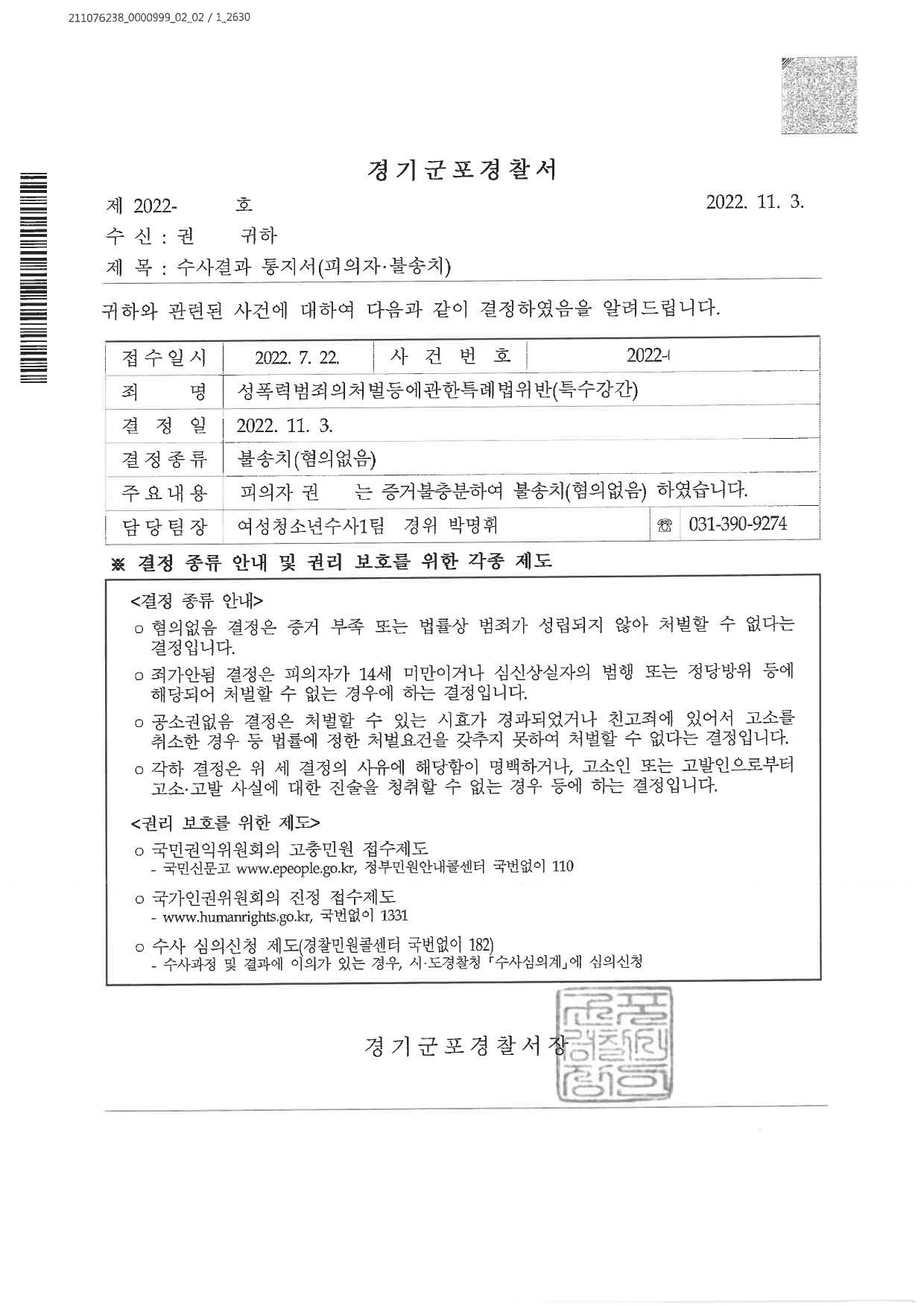 결국 고소인의 허위주장은 증거가 불충분하다고 판단되어 피의자는 경찰단계에서 불송치(혐의없음)처분을 받게 되었습니다. 강간죄나 준강간죄의 경우 고소인이 고소를 한 동기에 대하여 소명을 하지 못하면 고소인이 특별한 이유 없이 성범죄 고소를 할 이유가 없다고 보는 것이 수사기관과 사법기관의 태도이므로 경찰 첫 조사부터 변호인과 함께 진술 하나하나를 세밀하게 펼쳐 나가야 하고, 고소인의 진술 중 신빙성과 구체성이 의심되는 부분을 조사과정에서 즉각즉각 캐치하여 나가는 과정이 매우 중요 합니다.