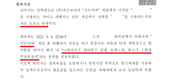 대학생 A씨는 '서든어택' 게임을 하던 중 팀원들이 자꾸 죽자 너무나 화가 난 나머지 팀원들 중 한 명인 B씨에게 "니여자친구 개따묵구 싶넹, 늘겅ㅅ네, 불고기 ㅏ한상 푸짐하것네"라는 채팅을 전송하였습니다.