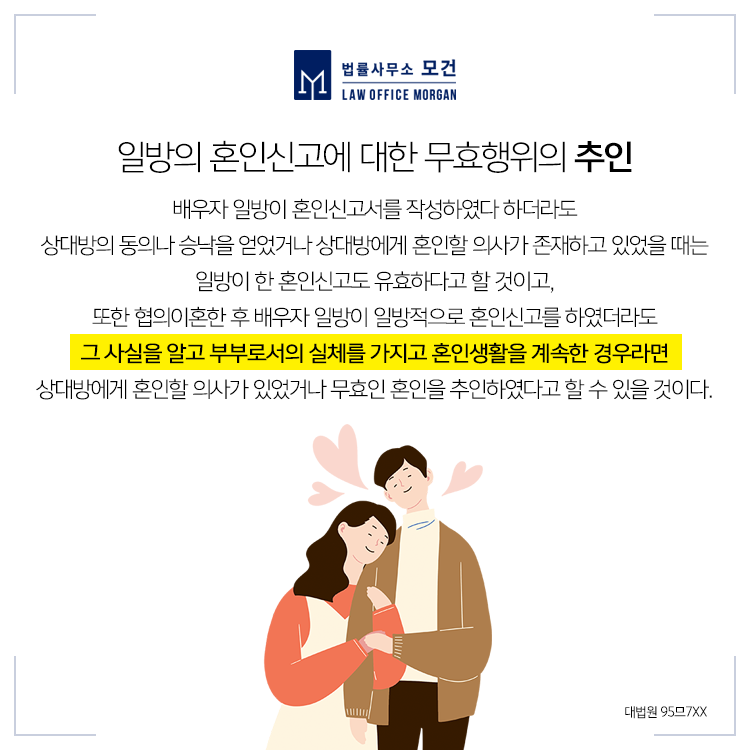 또 연인·동거관계에서 혼인관계를 창설하고자 하는 일방에 의해 동의없는 혼인신고가 이루어지는 경우도 있습니다. 이경우에는 혼인무효소송은 물론 상대방의 동의없는 혼인신고서 작성으로 인한 사문서위조 및 위조사문서행사로 형사고소도 이루어질 수 있어 이에 대한 전 과정에 걸친 법률조력을 받으셔야 합니다.