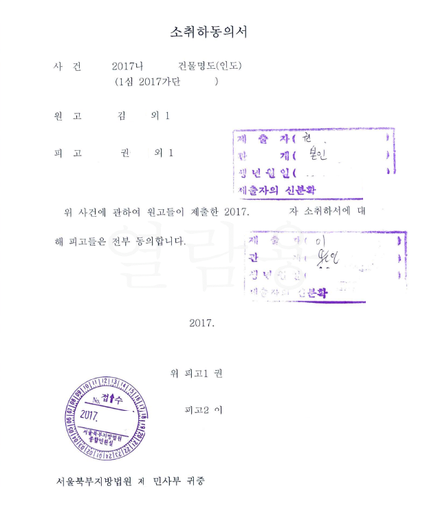 그러자 상대방들은 소란을 피우며 명도를 거부하였고 추완항소를 제기하였습니다. 저는 즉시 항소심에서 상대방들의 주장이 아무런 이유 없음을 주장하고 조속히 판결을 선고하여 명도를 허가해 줄 것을 법원에 요청하였습니다. 상대방들은 상황이 불리해지자 의뢰인에게 명도를 약속하고 퇴거하였으며 저는 소기의 목적을 달성하였으므로 소취하로 소송을 종료하였습니다.