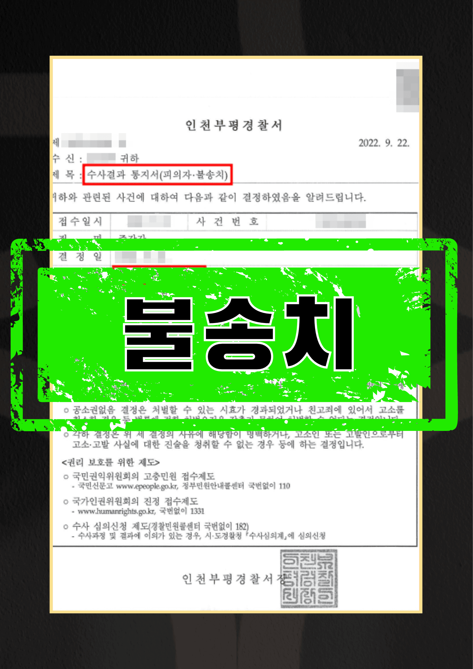 이에 인천 부평경찰서는 의뢰인 진술, 참고인 진술, 국과수 감정결과, cctv영상 등을 근거로 불송치결정을 하였습니다. 의뢰인은 현재 일상으로 되돌아가 가족들과 함께 평안한 일상을 영위해나가고 있습니다.