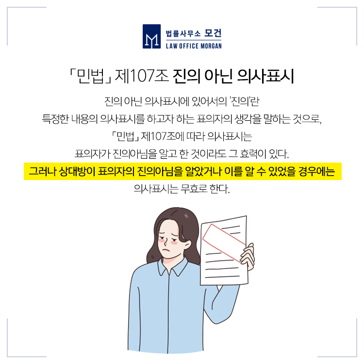 약정금청구소송에서 당사자간 다툼이 되는 부분이 「민법」 제107조 '진의 아닌 의사표시' 입니다. 예를 들면 '협의이혼하면 얼마의 위자료를 주겠다'라고 약속한 의사에 있어, 본인이 진심을 가지고 약속한 것이 아니라는 사정을 상대방도 알았거나, 알 수 있었을 경우에는 이는 '무효'라는 주장입니다.