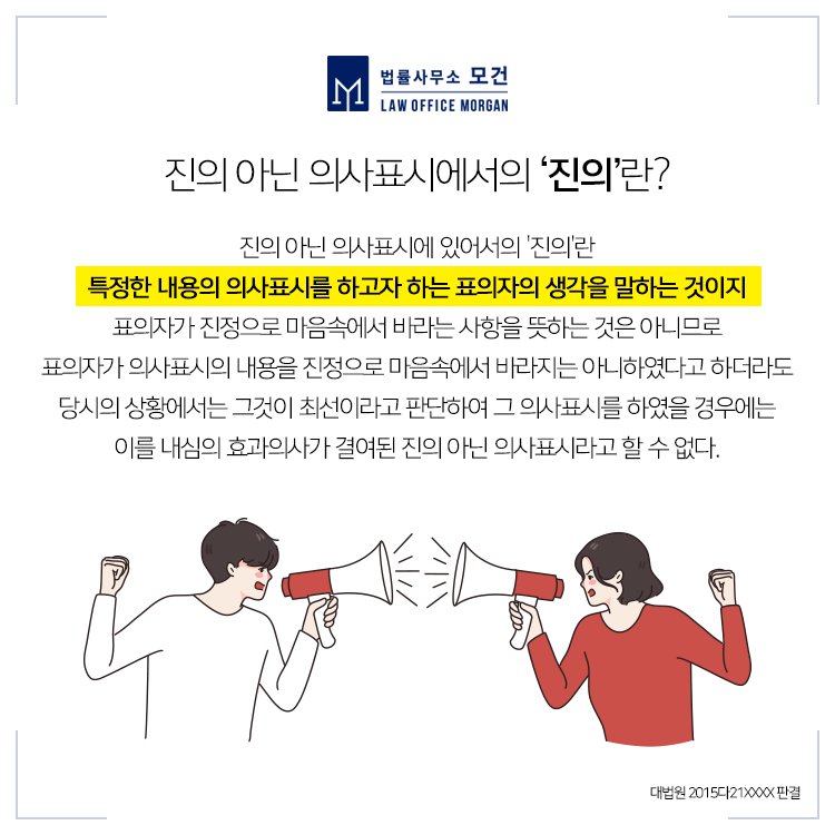 하지만 재판부는 '표의자인 B씨가 이 사건 합의서에 표시된 내용을 진정으로 마음속에서 바라지 아니하였더라도 당시 상황에서는 최선이라고 판단하여 위와 같은 합의서를 작성하여 준 것으로 보이고, 둘이 나눈 메시지 등을 고려할 때 비진의의사표시에 따른 무효라 보기 어렵다고 판단, "B씨는 A씨에게 3,000만원 및 지연손해금을 지급하라"고 판결하였습니다(창원지법 2020나6XXXX).