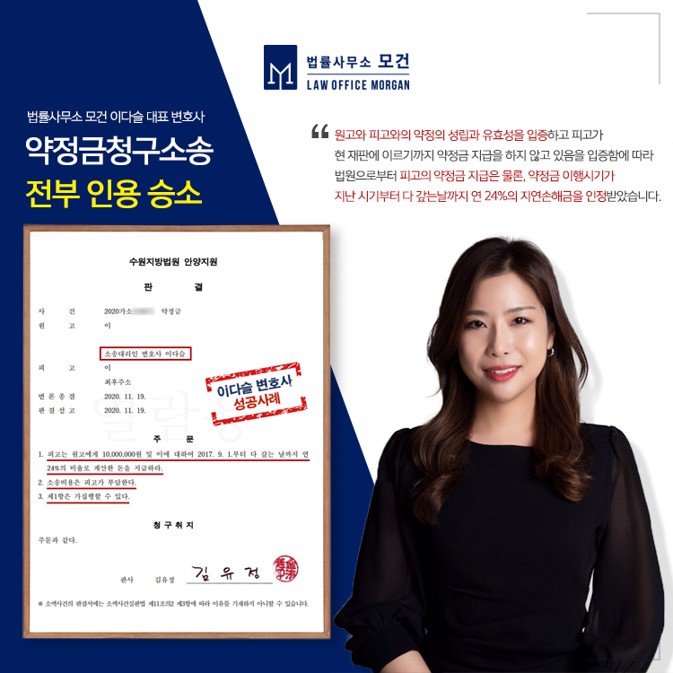 법률사무소 모건의 이다슬 대표 변호사는 대한변호사협회등록 이혼전문변호사로서 이혼 이후에 발생하는 금전적인 문제까지 명쾌하게 접근하여 해결하고 있습니다. 또 약정금청구소송이나 지급명령, 소액심판사건에서도 최선을 다하고 있으니 법률도움이 필요하신 분들은 법률사무소 모건으로 문의하시기 바랍니다.