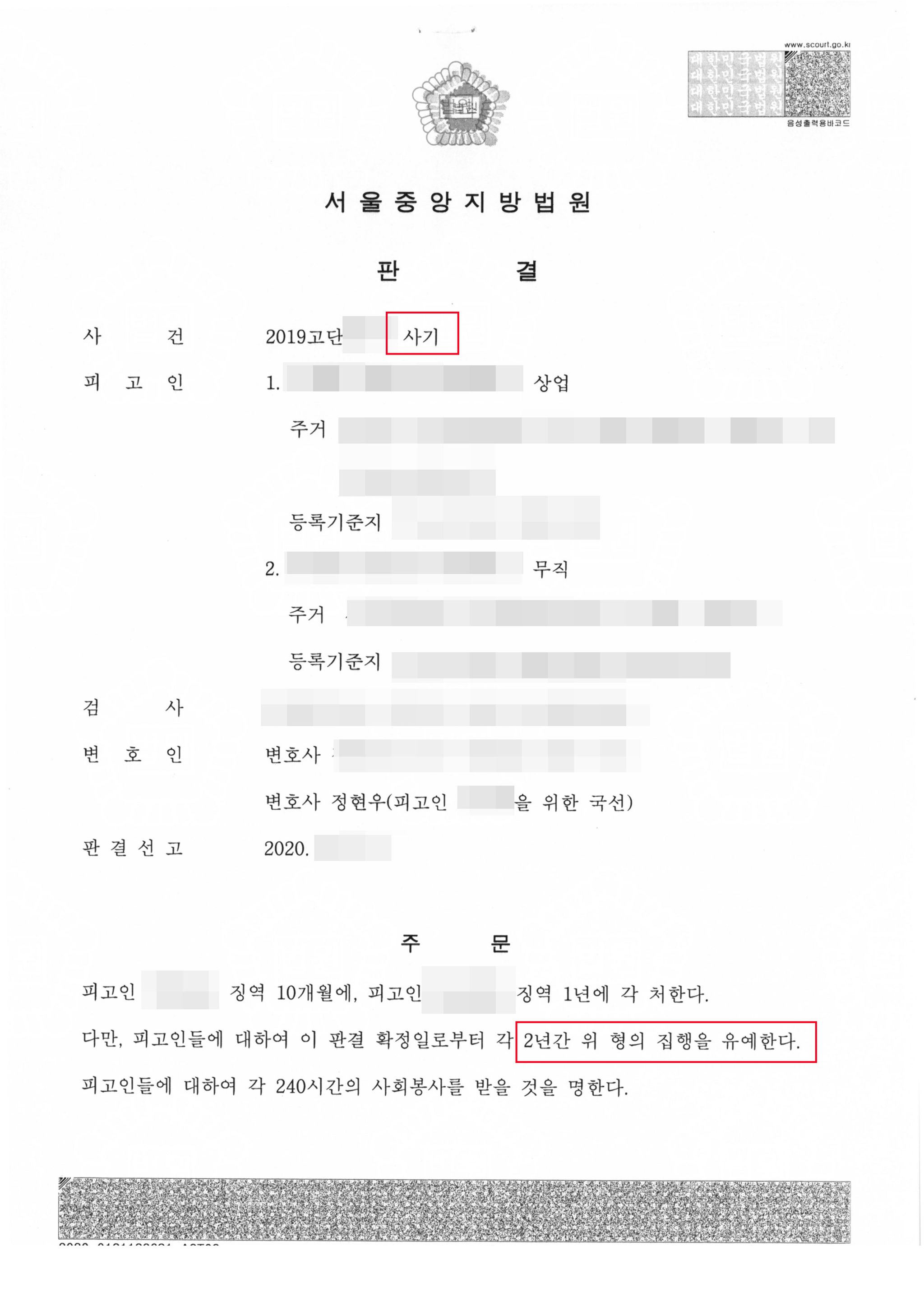 이렇게 중형이 아닌 집행유예를 선고받을 수 있었던 이유는 피해금액이 적지 않고, 피해자들이 처벌을 원하는 점 등으로 고려했을때에는 중형으로 다스려야 함이 마땅하지만, 의뢰인이 충분히 반성하고 있고, 과거 동종 형사처벌을 받은 전력이 없다는 점 등을 법원에서 정상참작하였기 때문입니다.