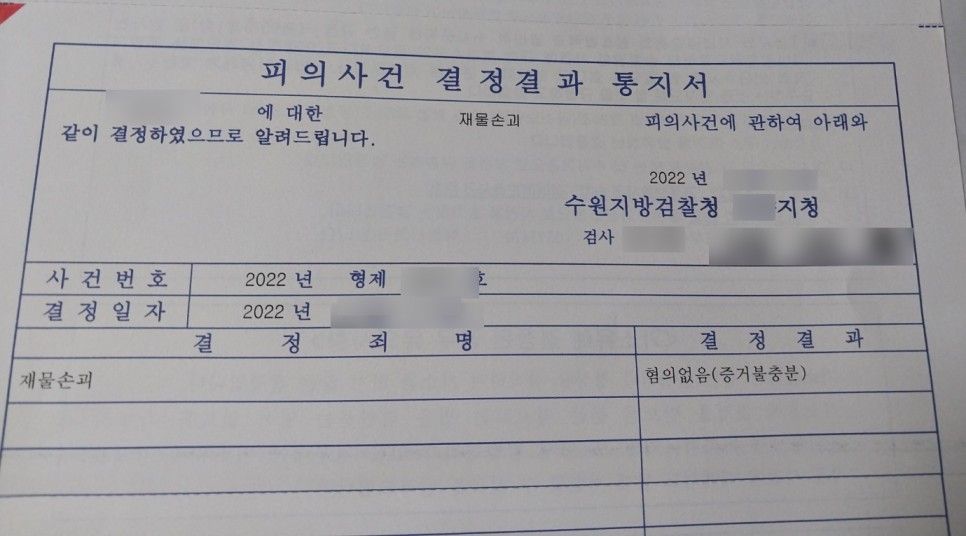 오늘은 저의 의뢰인의 재물손괴 혐의에 대하여 검찰에서 불기소처분(혐의없음)을 받은 성공사례에 관하여 포스팅해 보려고 합니다.