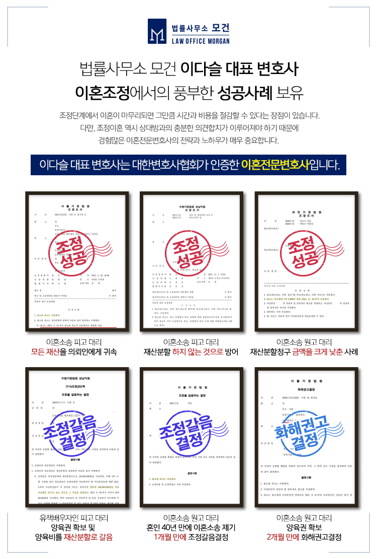 법률사무소 모건의 이다슬 대표 변호사는 대한변호사협회 인증 이혼전문변호사로서 협의이혼에서의 법률자문 뿐만 아니라 이혼조정과 이혼소송에도 풍부한 성공사례를 보유하고 있습니다. 수많은 경험과 성공사례에서 축적된 실무적 노하우로 사건을 바라보고 의뢰인께서 원하시는 결과를 도출하기 위해 최선을 다하고 있으니 상담이 필요하신 분들은 법률사무소 모건으로 문의하시기 바랍니다.