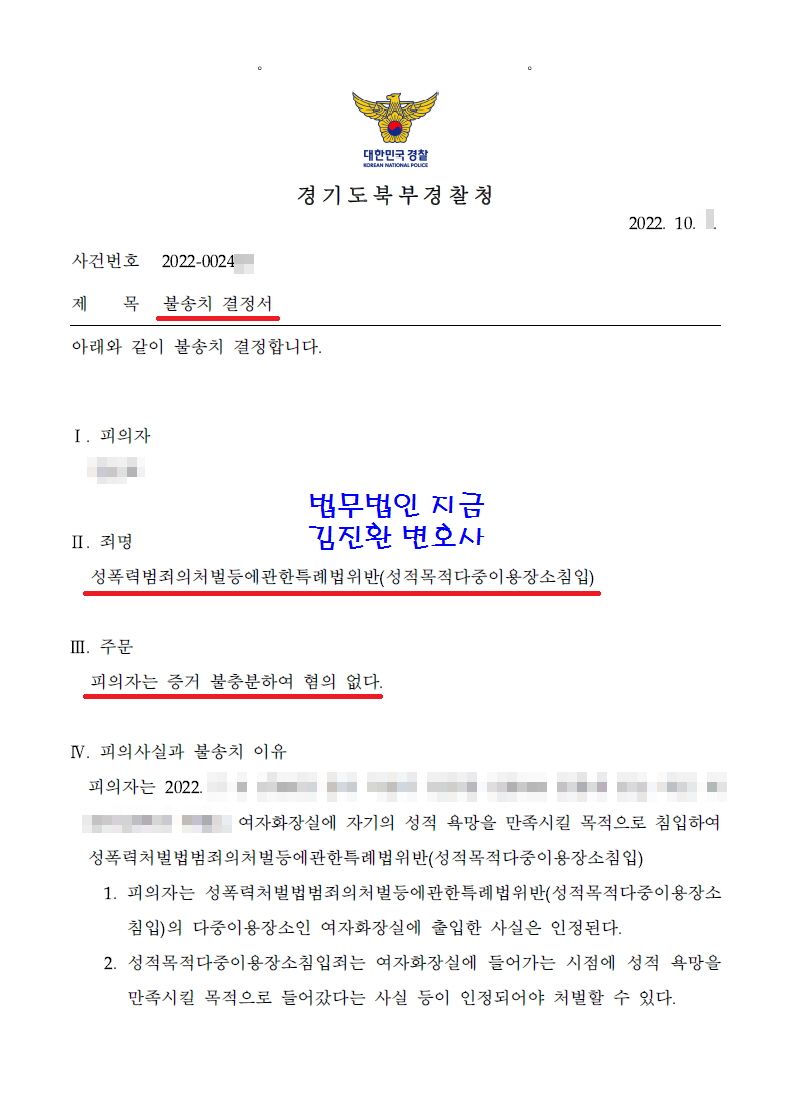 성폭력범죄의처벌등에관한특례법 제12조에서 규정하고 있는 성적목적다중이용장소침입죄가 성립하기 위해서는 피의자에게 '자기의 성적 욕망을 만족시킬 목적'이 있어야 하는데 의뢰인은 이러한 목적이 아닌 다른 목적으로 불가피하게 여자화장실을 들어간 것이기 때문에 범죄가 성립하지 않는다는 변호인의견서를 작성해 경찰관에게 제출하였고 담당 수사관은 이러한 의견을 받아들여 무혐의 결정을 내리게 되었습니다.
