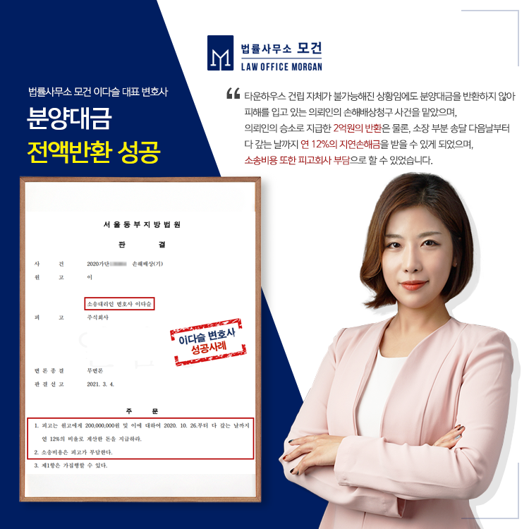 법률사무소 모건의 이다슬 대표 변호사는 대한변호사협회 등록 형사전문변호사로서 각종 사기사건에서 형사사건과 민사소송을 맡아 의뢰인께서 원하는 결과를 이끌어내왔습니다. 상담예약 시 대표 변호사가 성심성의껏 직접 상담하고 있으니 도움이 필요하신 분들은 법률사무소 모건으로 문의하시기 바랍니다.