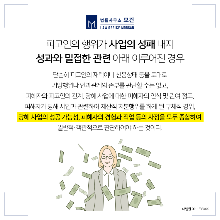예를들어 투자금을 받더라도 본인이 개인적인 용도로 사용할 생각이었음에도 주식투자나 사업운영에 활용할 것이라 속였거나, 투자금을 투자에 투입한다 하더라도 피해자에게 약정한 수익을 낼 수 있는 상황이 아니어서 피해자에게 약속한대로 수익금을 지급하고 원금을 반환할 의사나 능력이 없었다면 사기죄가 성립할 수 있습니다.