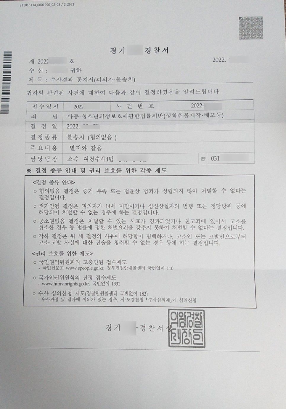 경찰 조사 당시 담당경찰관이 이미 검찰에 송치할 듯한 말을 여러 차례 하였기에, 경찰이 이 사건 성착취물제작, 통매음을 불송치할 거라는 기대는 하지 않았고 검찰에서는 불기소 처분을 할 수 있겠다는 기대를 하였지만, 경찰단계에서 곧바로 불송치처분이 나왔습니다.