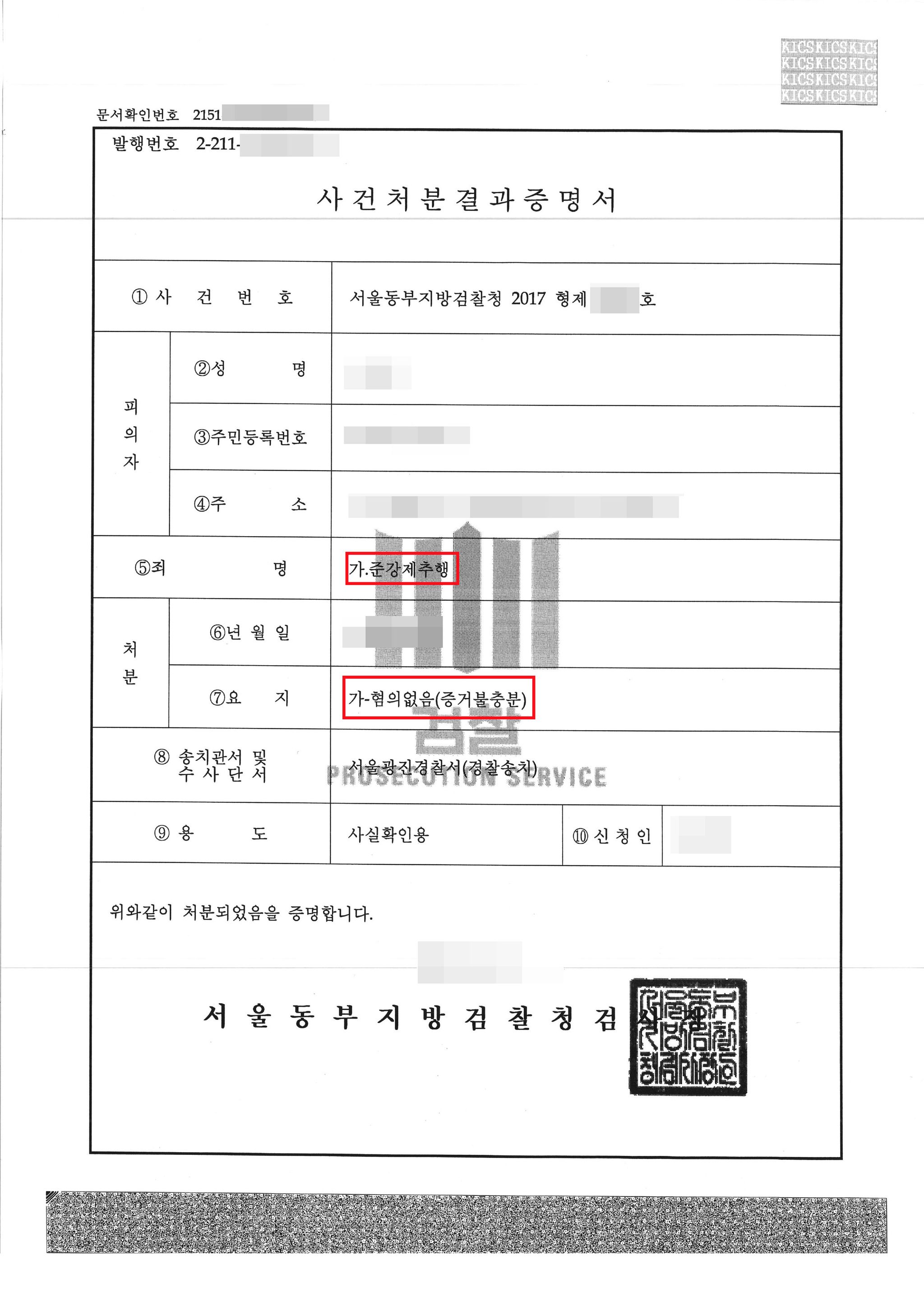 그 결과 경찰 수사 단계에서 사건은 마무리될 수 있었습니다. 경찰은 본 변호인의 주장을 모두 받아들여 준강제추행 혐의를 입증할 만한 증거가 없다고 판단하여 의뢰인에게 혐의없음으로 불송치하는 결정을 내렸습니다.