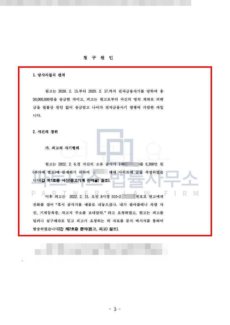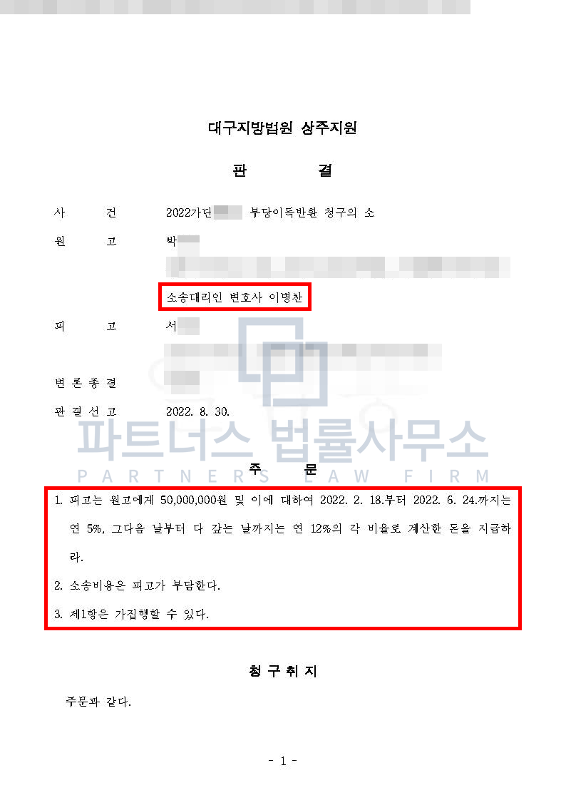 의뢰인의 경우 보이스피싱 피해를 당해 자신의 돈 5천 만원을 입금한 계좌명의인을 상대로 부당이익반환청구를 한 사안입니다. 보통의 경우 계좌명의인도 속아서 보이스피싱 대포통장으로 이용이 되어서 그 계좌명의인이 벌금이하의 경미한 처벌을 받게 되면 그 명의인을 상대로 한 민사소송도 패소를 하게되는 것이 일반적입니다. 그러나 이번 사안에서는 저희 사무소의 치밀한 변론으로 전부승소를 하였던 사안입니다
