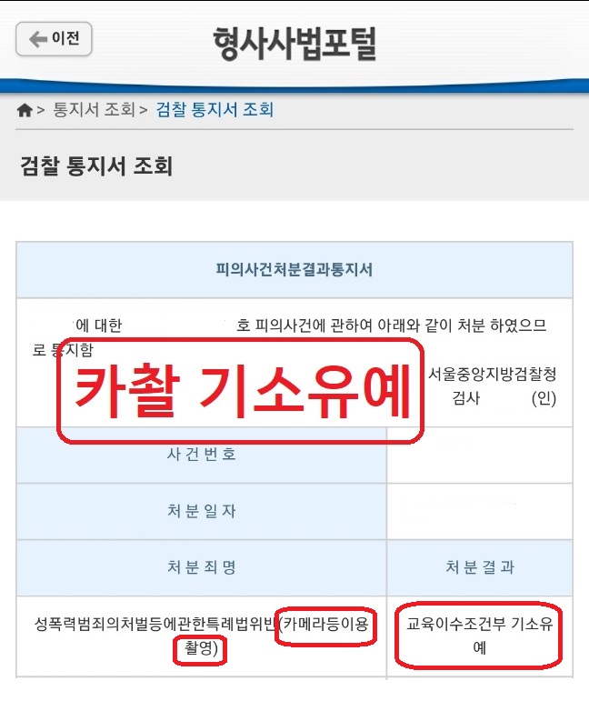 결국 검찰에서는 이러한 사항들을 고려하여 카메라등이용촬영죄(카촬) 혐의에 대하여 의뢰인에게 교육이수조건부 기소유예 처분을 결정했습니다.