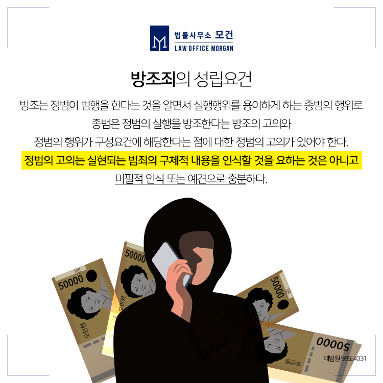 처음부터 보이스피싱 사기범죄를 방조한다는 점을 명확히 인식하지는 못하였다고 하더라도, 그 수금방식의 익명성과 허위성 등을 통해 불법적인 일이라는 점을 인식하고서도 이를 용인하고 행위에 나아갔다면 사기방조의 혐의가 인정될 수 있습니다.