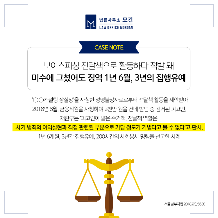 법률사무소 모건의 이다슬 대표 변호사는 보이스피싱 사건에서 사기, 사기방조, 사문서위조 및 위조사문서행사, 전자금융거래법위반 등의 다양한 유형별 대응 노하우를 가지고 있어 의뢰인의 사정에 맞는 법률조력을 제공하고 있습니다. 형사변호사이자 보이스피싱전문변호사인 대표 변호사가 직접 상담하고 대응하고 있으니 종로, 마포, 광화문 등 도움이 필요하신 분들은 법률사무소 모건으로 문의하세요.