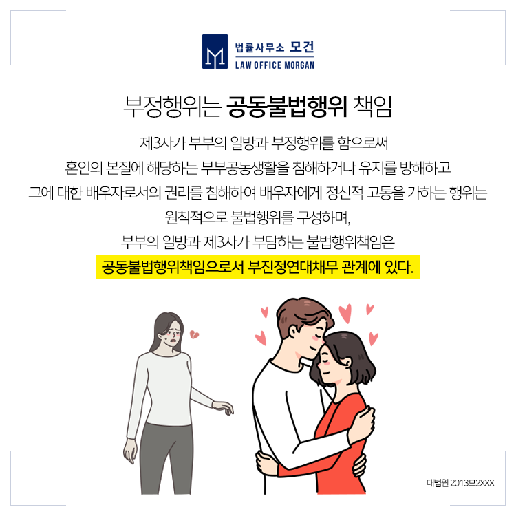 법원은 "부부의 일방과 제3자가 부담하는 불법행위책임은 공동불법행위책임으로서 부진정연대채무 관계에 있다"고 보고 있습니다. 부진정연대채무란 하나의 동일한 급부에 대하여 여러 명의 채무자가 각기 독립하여 그 전부를 급부해야 하는 의무를 부담하는 채무를 말합니다.