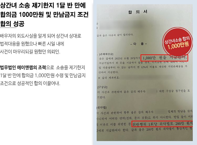 이에 신상민 변호사는 의뢰인의 의견을 받아들여 상간녀 측과 합의를 시도하였고 최종적으로 상간녀가 의뢰인에게 위자료 1,000만 원 지급 및 향후 만남금지 조건으로 합의가 성립되었습니다.