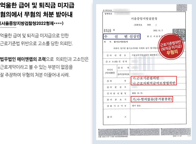 하지만 이후 a씨는 의뢰인을 근로기준법위반(퇴직금 미지급)으로 고소하였고 의뢰인은 a씨와 근로계약을 체결한 적이 없었기에 해당 고소에 대응을 하고자 저희 법무법인 에이앤랩을 찾아오게 되었습니다.