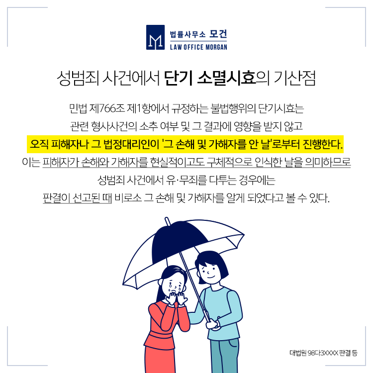 그런데 통상적으로 성범죄 사건은 피해자가 가해자를 형사고소한 뒤 민사상 손해배상청구소송을 하게되므로, 간혹 앞선 형사사건에서 유죄가 확정된 시기가 불법행위로부터 3년이 넘어버리는 경우가 있습니다. 또 사건 이후 뒤늦게 고소 및 소송을 진행하는 경우도 소멸시효의 완성이 위험할 수 있는데요. 이와 관련하여 법원은 어떻게 판결을 내리고 있는지 살펴보도록 하겠습니다.