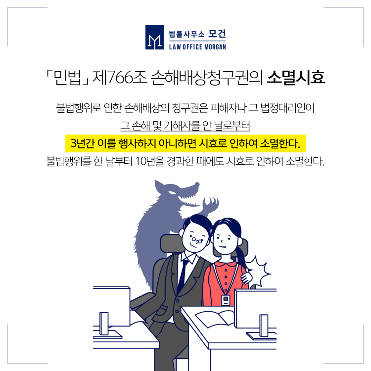 형사사건에서는 '공소시효'가 있지만, 민사소송에서는 '소멸시효'가 있어 소멸시효가 완성되면 손해배상청구가 불가능해집니다. 불법행위로 인한 손해배상청구권은 피해자가 그 손해 및 가해자를 안날로부터 3년간 이를 행사하지 않으면 시효로 소멸하고, 불법행위를 한 날로부터 10년을 경과한 때에도 시효로 소멸합니다.
