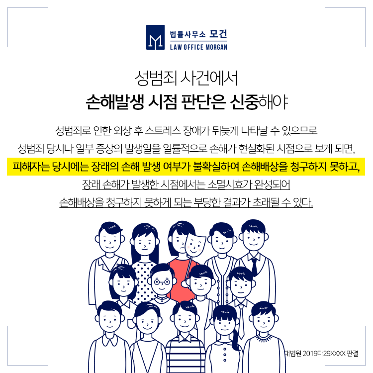 이에 대법원은 특히 피해자가 피해 당시 아동이었거나, 가해자와 친족관계를 비롯한 피보호관계에 있었던 경우 등 특수한 사정이 있는 때에는 더욱 그러할 수 있다고 보고, 전문가로부터 성범죄로 인한 정신적 질환이 발현되었다는 진단을 받기 전에 외상 후 스트레스 장애로 인한 손해의 발생이 현실적인 것으로 되었다고 인정하는 데 매우 신중할 필요가 있다고 본 사례입니다(대법원 2019다29XXXX).