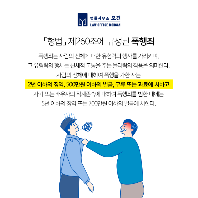 이처럼 억울한 폭행사건에 휘말리게 된 경우에는 본인의 주장을 증명할 수 있는 증거확보와 신빙성있는 진술을 갖추어 수사에 임하셔야 합니다. 단순폭행죄의 경우 반의사불벌죄로 피해자와 합의 시 형사처벌을 면할 수 있으나, 합의가 불가능하거나 피해자가 폭행으로 상해를 입었다면 처벌을 피할 수 없으므로 형사변호사의 긴밀한 조력이 매우 중요합니다.