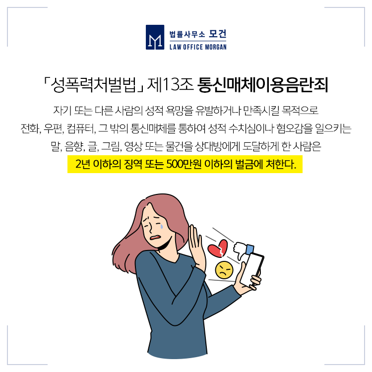 타인에게 성적수치심이나 혐오감을 일으키게 하는 말이나 사진, 영상을 전송하는 것도 형사처벌의 대상이 됩니다. 바로 「성폭력처벌법」 제13조에서 '통신매체이용음란죄'를 2년 이하의 징역 또는 2천만원 이하의 벌금으로 처벌하고 있기 때문인데요.