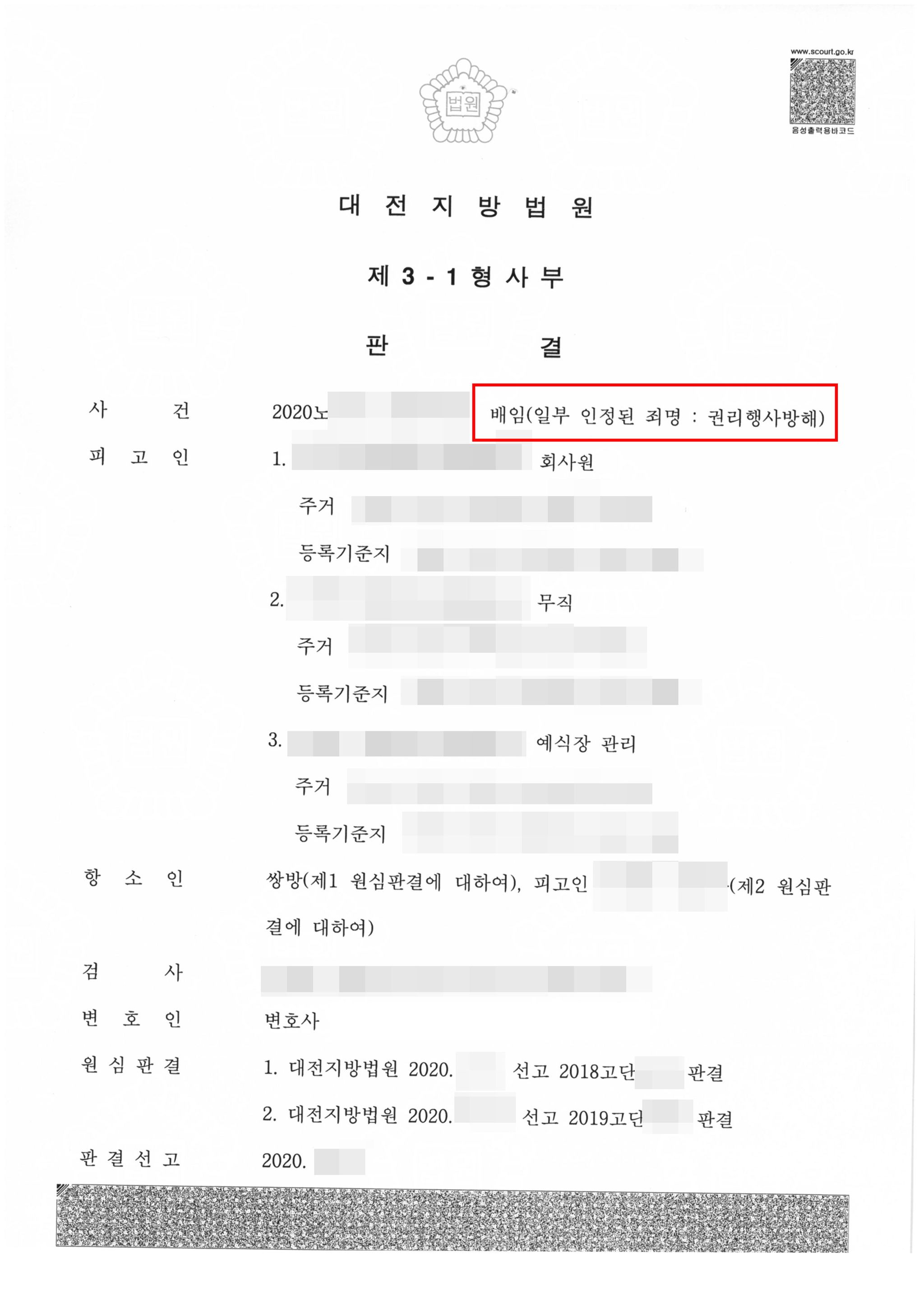 다만 가해자 A씨와 B씨, C씨는 모두 1심에서 선고된 형량이 무겁다면서 항소를 제기하였습니다. 그리고 2심 항소심 재판과정에서 가해자들은 피해자인 의뢰인측이 배임이라는 사실에 대한 오인과 법리를 오인하였다고 주장하였습니다.
