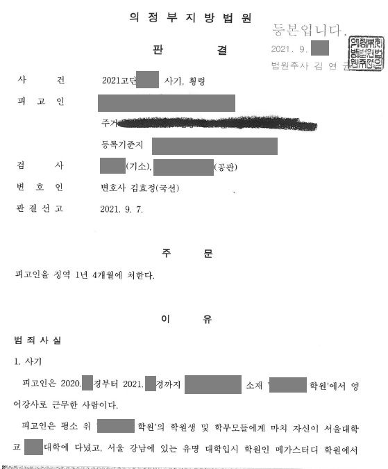 가해자인 학원 강사는 자신이 서울대학교 치과대학에 다녔고 서울 강남에 위치한 유명 입시학원인 메가스터디 학원에서 오랫동안 근무하여 경험이 풍부한 것처럼 거짓말을 하여 자신을 신뢰하게 한 후, 학부모들에게 대학입시 컨설팅을 해주겠다며 고액의 돈을 받았습니다. 피해자인 의뢰인은 자녀 교육에 관심이 많은 학부모로 그 강사의 말을 믿고 4개월에 걸쳐 7,240만원을 송금하였는데, 그 강사가 잠적하였다는 소식을 듣고 또 자신과 같은 피해를 입은 학부모가 여러 명이라는 사실을 알게 되자 법적 조치를 위해 저를 찾아오게 되었습니다.