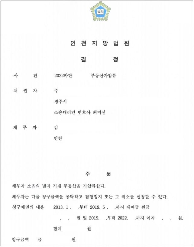 그러나 최미선변호사는 최초에 돈을 빌리던 시기에는 부인도 이자를 입금한 내역이 있었던 점, 돈의 대여 목적이 일상가사에 속하는 점 등을 근거로 판사님을 설득하였고, 결국 아내 명의의 부동산에 대한 가압류 결정을 받게 되었습니다.