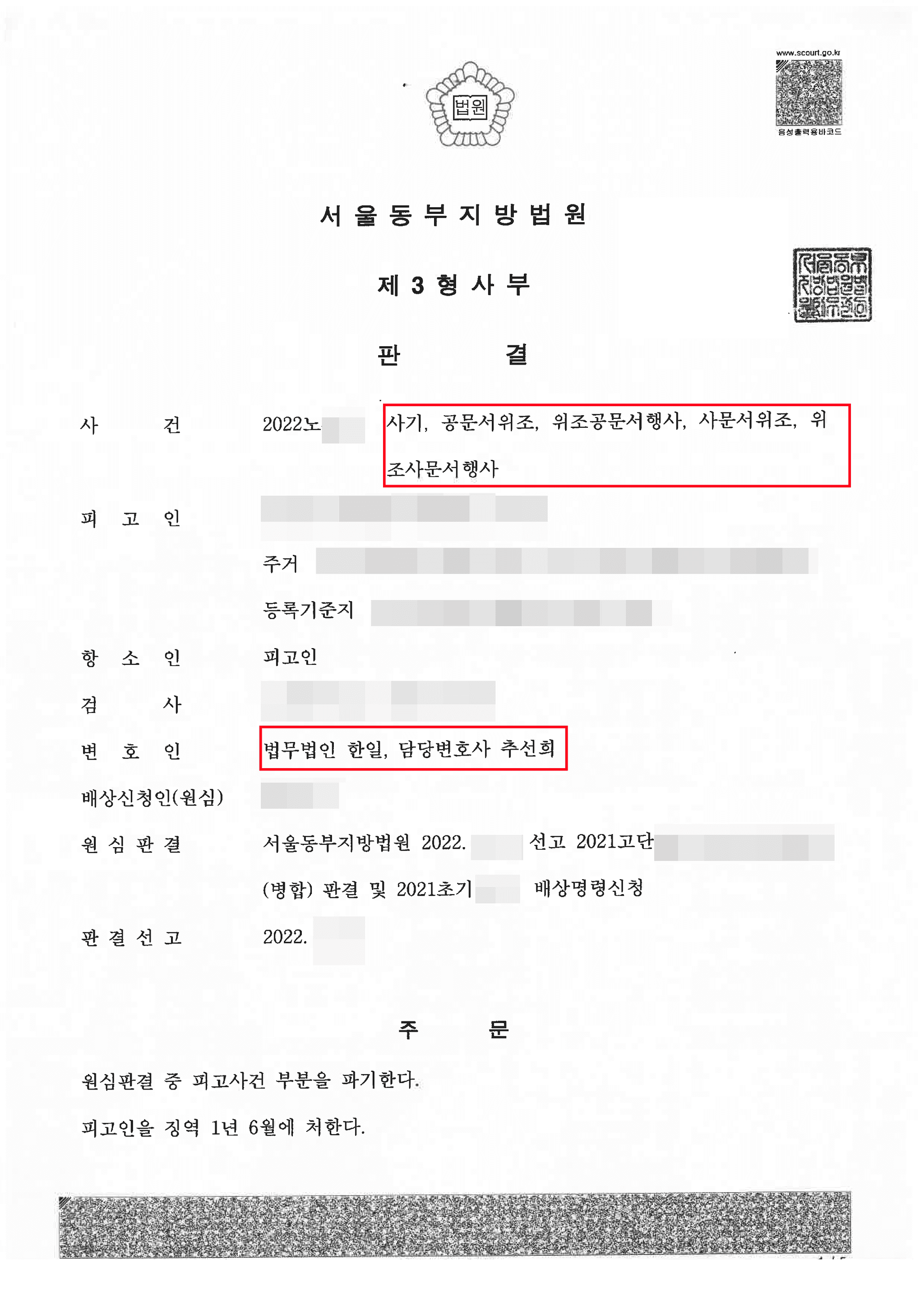 2심 항소심 재판부는 이러한 본변호인의 주장과 자료를 모두 받아들여 원심을 파기하고 징역 1년 6월, 집행유예 2년을 선고하였습니다.