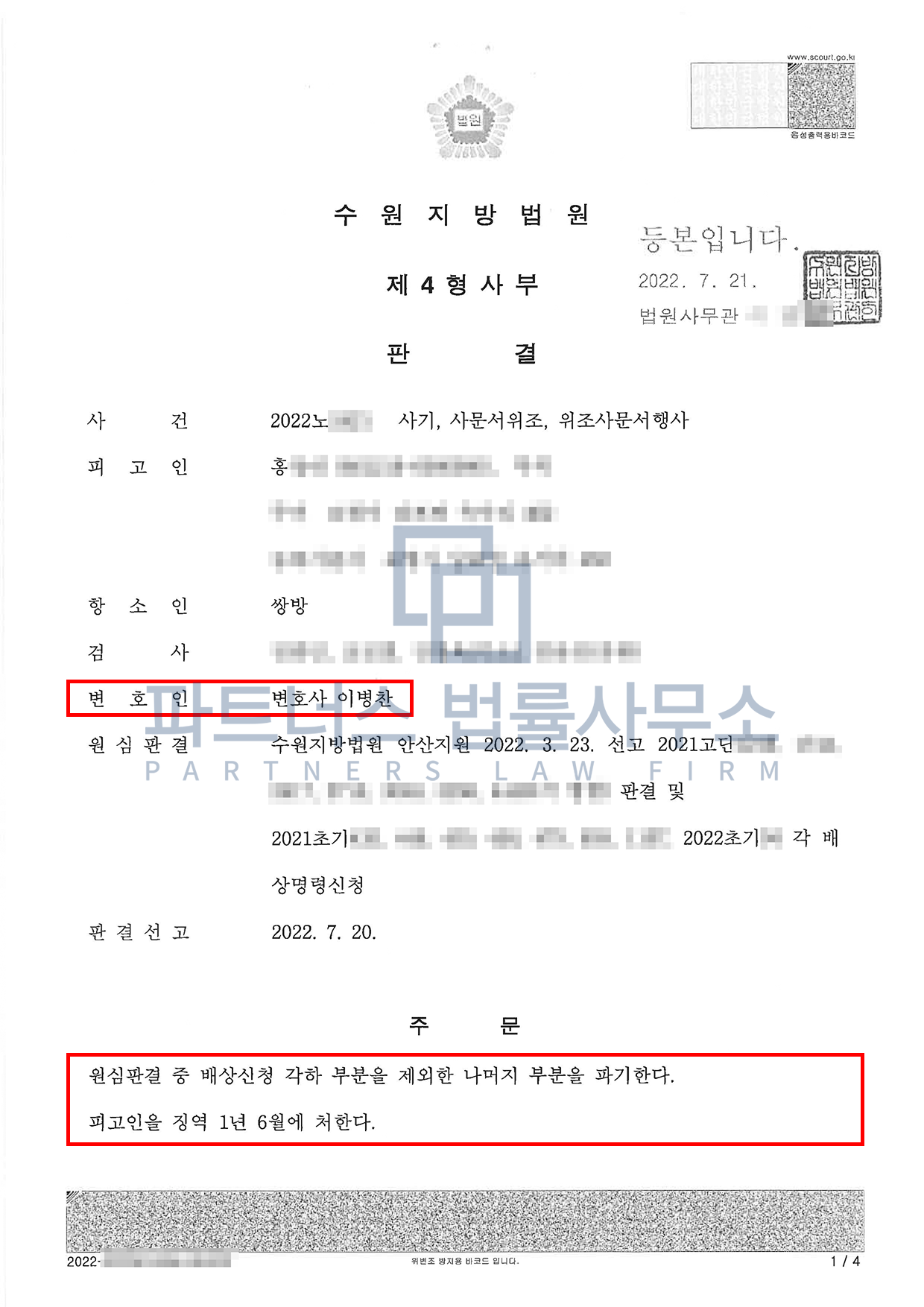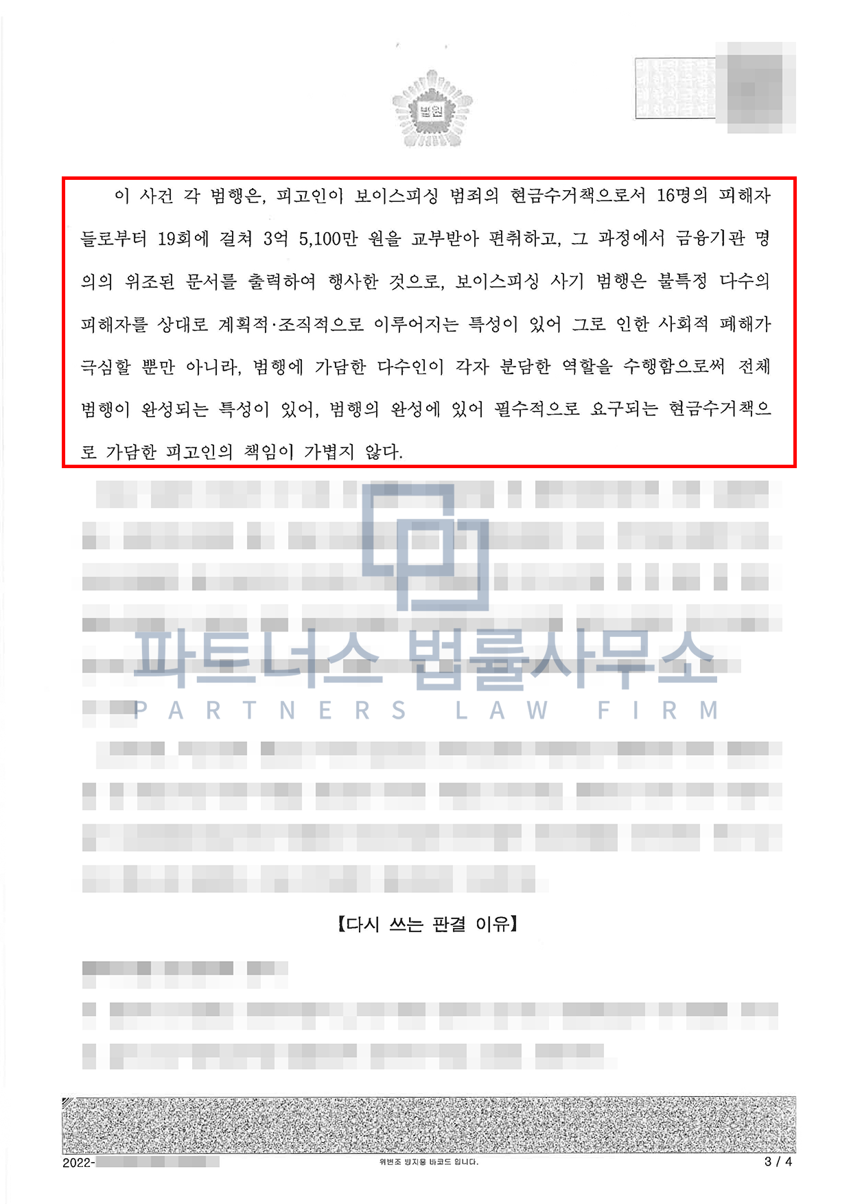 그러나 저희 파트너스법률사무소는 ① 의뢰인이 이 사건 사기 등 각 범행을 주도하거나 계획한 것이 아닌 점, ② 처음부터 확정적인 고의를 가진 채 범행에 가담한 것이 아닌 점, ③ 의뢰인이 범행을 통해 얻은 이익은 편취 금액의 일부에 불과한 점 등에 비추어 의뢰인의 경우 보이스피싱 사기에 대한 고의가 없었다는 점을 치밀하고 논리적으로 주장하였습니다.