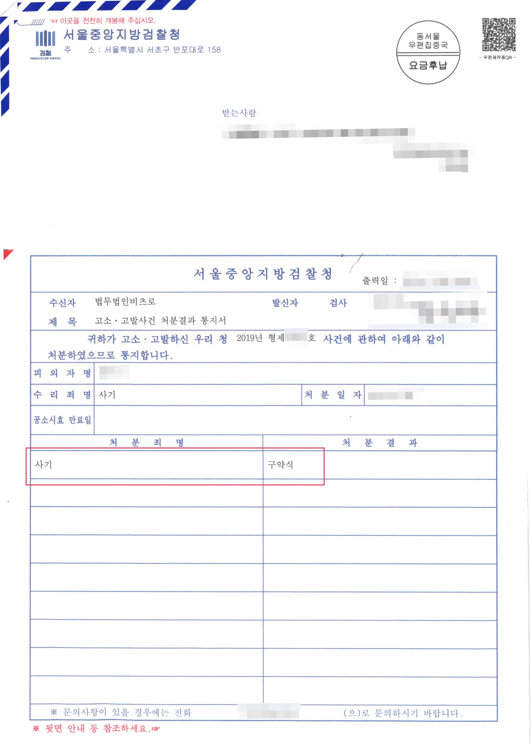 이번 사건도 기망행위가 있음을 객관적인 증거자료로 적극적으로 소명한 결과로, 피고소인에게 구약식처분으로 벌금형이 내려진 사건이었습니다.