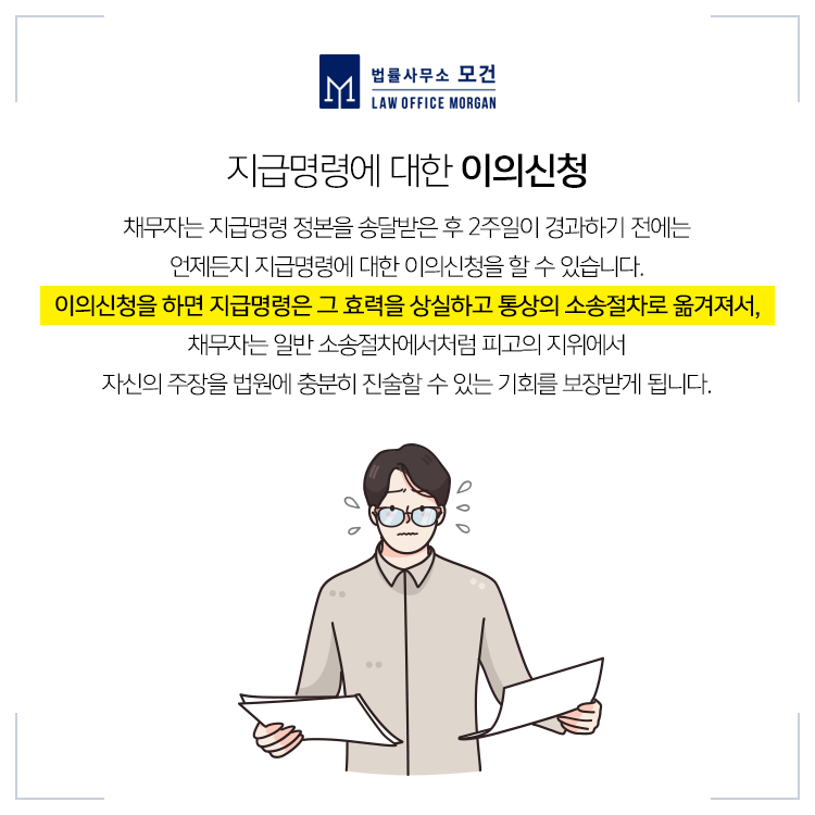 그런데 오늘 소개해드릴 '지급명령'은 위와 같은 민사소송의 단점을 보완한 것으로 이 역시 법원이 관여하는 주요한 민사분쟁 해결절차 중 하나입니다. 저렴한 비용과 빠르고 간소화된 절차로 소액사건에도 유용하게 활용됩니다. 현재 종로민사변호사 법률사무소 모건에서는 지급명령 변호사비용을 33만원에 진행해드리고 있습니다.