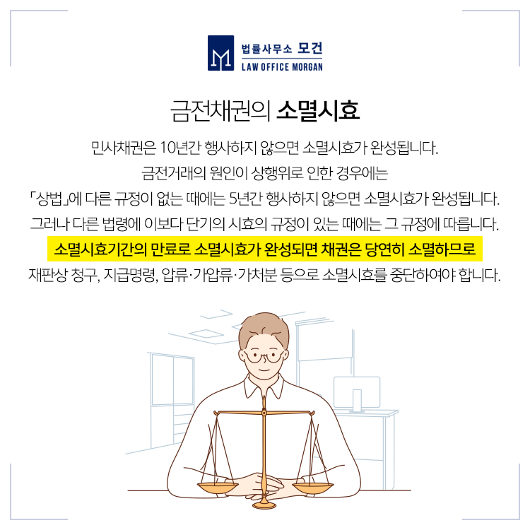 모든 채권은 소멸시효가 존재합니다. 법에서 정한 소멸시효가 완성되면 채권자라 하더라도 돈을 받을 권리는 사라지게 되는 것인데요. 일반적인 대여금은 민법에 따라 10년의 소멸시효가 적용되고, 상행위로 인한 채권은 상법에 따라 5년의 소멸시효가 적용됩니다. 또 상인이 판매한 상품의 대가나 임금 등의 특수한 채권에는 3년에서 1년까지의 단기의 시효기간이 인정되는데요.