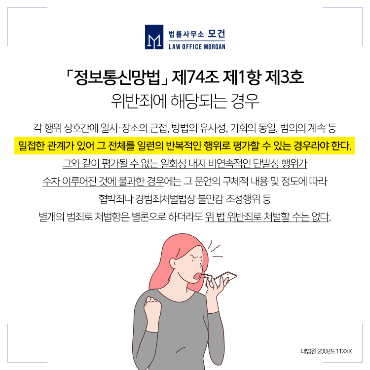 「정보통신망법」 제44조의 7에서는 불법정보의 유통을 금지하면서 '공포심이나 불안감을 유발하는 부호·문언·음향·화상 또는 영상을 반복적으로 상대방에게 도달하는 내용의 정보'를 유통하여서는 안된다고 정하고 있습니다.
