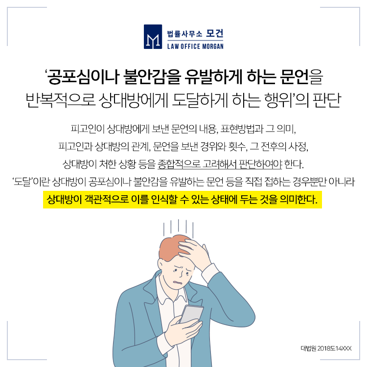 이처럼 불안감·공포심 조성죄는 실제 고소인이 불안감과 공포심을 느꼈는지가 주요 쟁점이 되는데, 이를 판단하려면 그 내용, 두 사람의 관계, 문언을 보낸 경위와 횟수, 전후사정, 상대방이 처한 상황 등을 종합적으로 고려하여야 하므로 형사전문변호사의 세밀한 법리적 판단을 필요로 합니다.