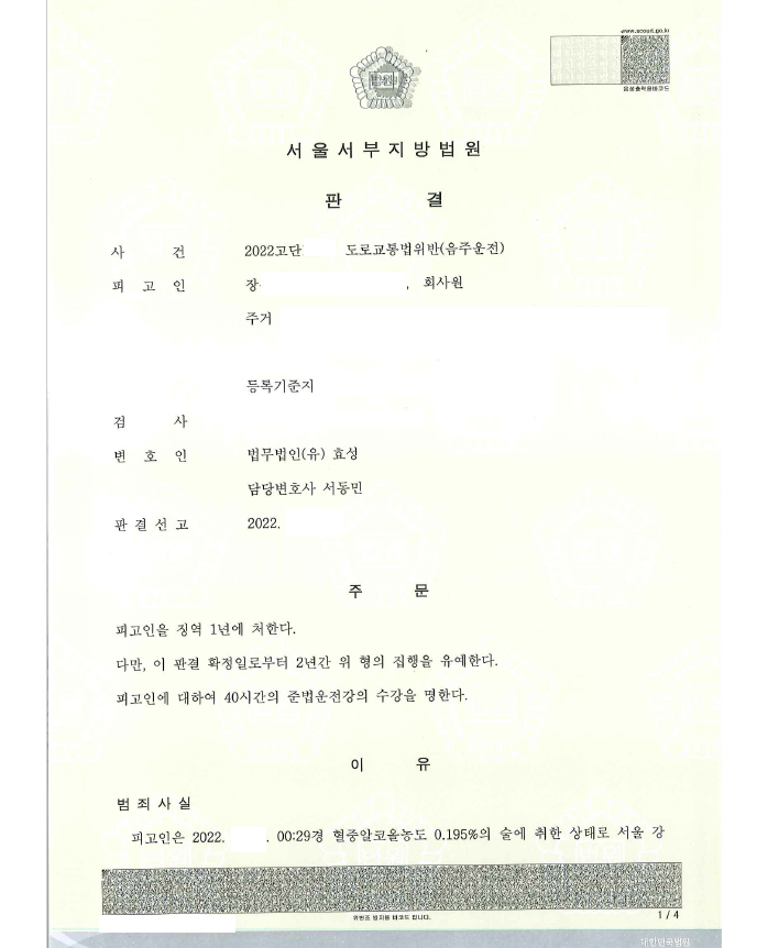 저는 사건의 경위, 음주운전 수치, 음주운전 거리, 재범의 위험성, 차량 처분 등 양형사유를 중점적으로 주장 입증하였고 법원은 집행유예를 선고하였습니다.