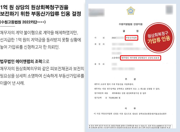 법무법인 에이앤랩 신상민, 임효정 변호사는 채무자의 원상회복의무와 같은 피보전채권과 보전의 필요성을 상세히 소명하였고, 현금 공탁 없이 전액 보증보험증권으로 갈음하여 신속한 부동산 가압류를 요청하였습니다.